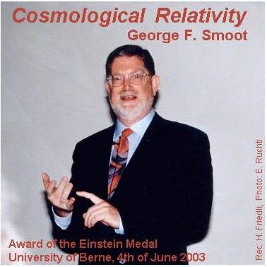 On June 4, 2003, Professor George Smoot was awarded the Albert Einstein Medal for 2003. The Einstein Prize was presented by Professor Peter Fricker, President of the Albert Einstein Society, at the University of Berne on the day of the hundred year anniversary of the main University building. The Einstein Medal was awarded to honor his outstanding scientific achievements in pioneering work on Cosmic Microwave Background (CMB) radiation. During the ceremony Dr. Smoot gave a talk entitled Cosmological Relativity.