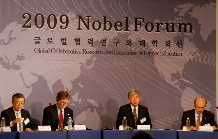 Forum speakers Seong Ki Baek, President of Postech;  Nobelist George Smoot;  Prof. Jae Ho Yeom, Korea University;  Nobelist Louis Ignarro
