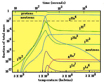 Below is a graphical summation of nucleosynthesis in the early universe. The graph shows the relative abundances of different nuclei (vertical axis) during the first three hours of creation. The horizontal axis has been labeled using both time (top) and the equivalent temperature (bottom). For those not used to using a logarithmic scale, a dashed line has been added at the 1% abundance level. Anything below this line would be less than 1% of the total mass present.