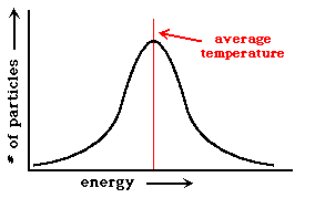 These collisions had three major results. The first was that the universe reached a condition called thermal equilibrium. To give you an idea about what this is we'll look at a glass of water at 40 degrees. The temperature of an object is a reflection of the amount of energy present in that sample of matter. However, not every molecule present has the energy that corresponds to 40 degrees. The total energy is actually spread out over a range of energies, so that there are some that have more energy than the corresponding temperature, and others that have less. This is what it looks like on a graph: